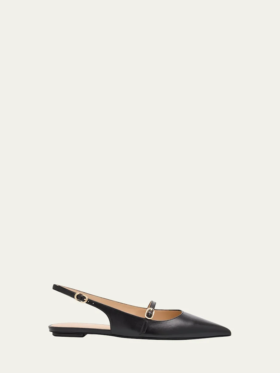 Stuart Weitzman "Emilia" smooth calf leather ballerina flats 0.17 in / 5 mm flat heel Pointed toe Mary Jane buckle strap Adjustable slingback strap Leather outsole Lining: Leather Professional cleaning recommended Made in Spain