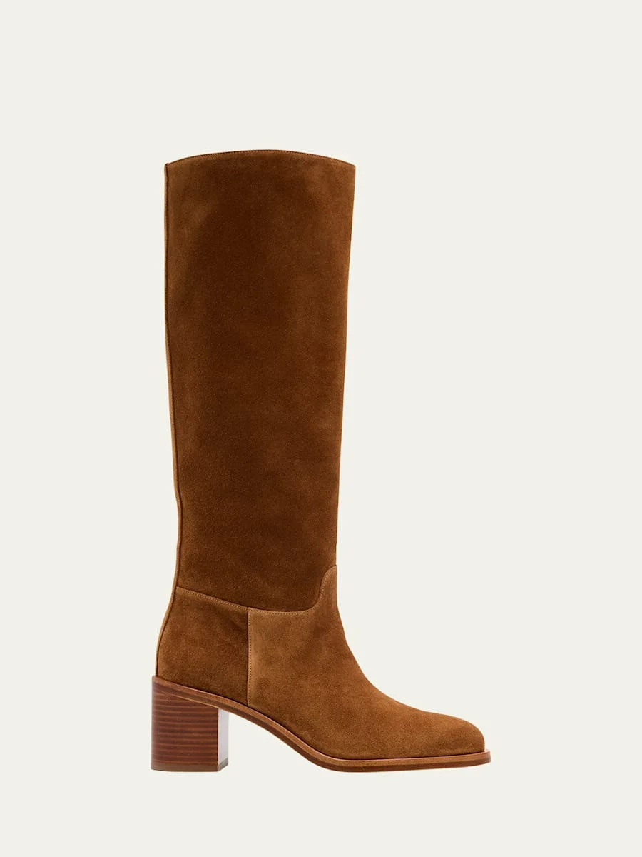 Stuart Weitzman "Finn" kneehigh boots in supple calf suede 2.25 in / 55 mm wood block heel Round toe Side zip eases dress Leather lining Leather/Rubber outsole Professional cleaning recommended Made in Spain