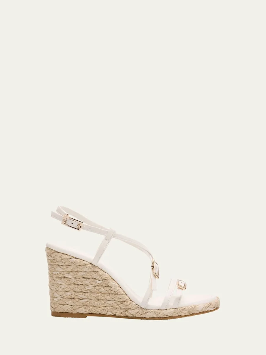 Stuart Weitzman "Georgie" strappy espadrille sandals in calf leather 3.50 in / 90 mm braidedjute wedge heel Open toe Dual band upper with a crisscross vamp and buckle accent Adjustable slingback strap Lightweight, sturdy TPU outsole Lining: Leather Made in Spain