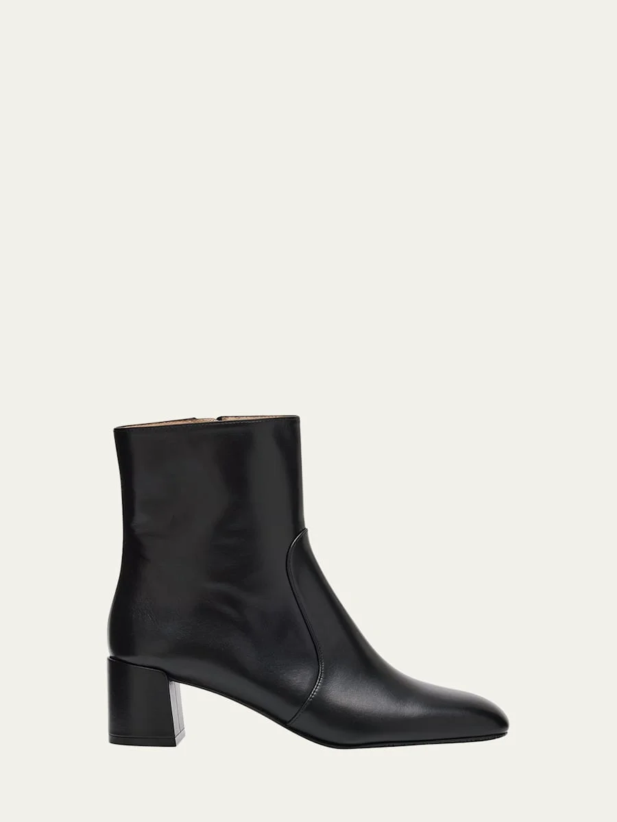 Stuart Weitzman "Maeve" booties in smooth calf leather 2.00 in / 50 mm block heel Round toe Side zip eases dress Leather lining Lightweight, sturdy TPU outsole Professional cleaning recommended Made in Spain Online Inquiries: BGS21_X6ZGZ| Store Inquiries: #5071328