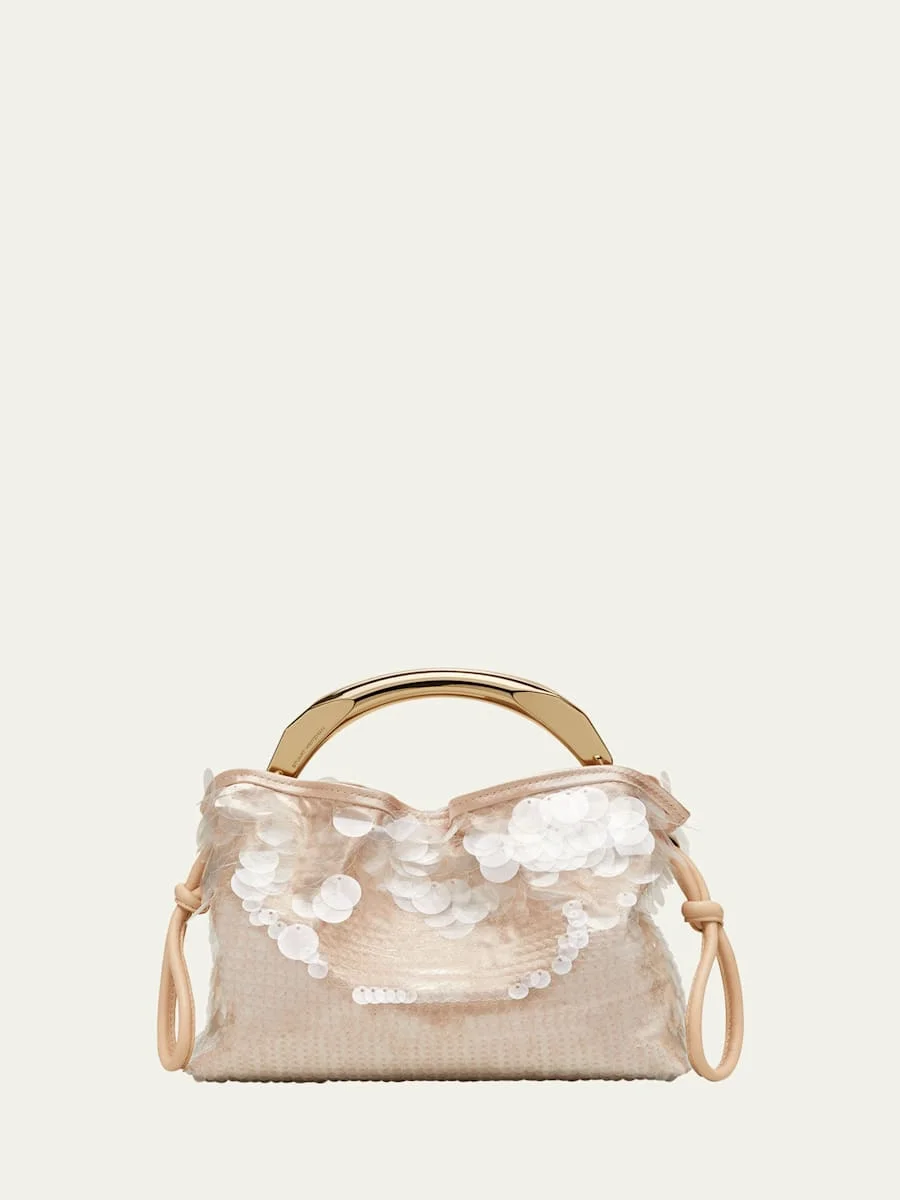 Stuart Weitzman "Mia Arc" top handle bag in allover sequin-embellished fabric Metal top handle Removable shoulder strap, 22" drop Can be worn as a top handle or shoulder bag Open top with magnetic closure Exterior, side drawstring accent Interior, one card slot Lining: Cotton Approx. 5.7"H x 8.5"W x 3.5"D Polyester/plastic Made in Italy Online Inquiries: BGS21_V6K2J| Store Inquiries: #5028221