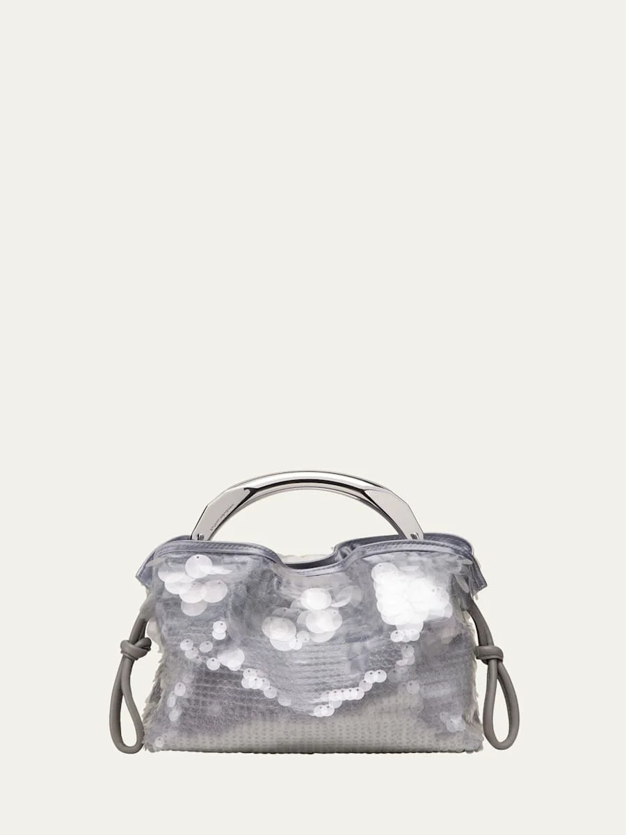 Stuart Weitzman "Mia Arc" top handle bag in allover sequin-embellished fabric Metal top handle Removable shoulder strap, 22" drop Can be worn as a top handle or shoulder bag Open top with magnetic closure Exterior, side drawstring accent Interior, one card slot Lining: Cotton Approx. 5.7"H x 8.5"W x 3.5"D Polyester/plastic Made in Italy Online Inquiries: BGS21_V6K2J| Store Inquiries: #5028221
