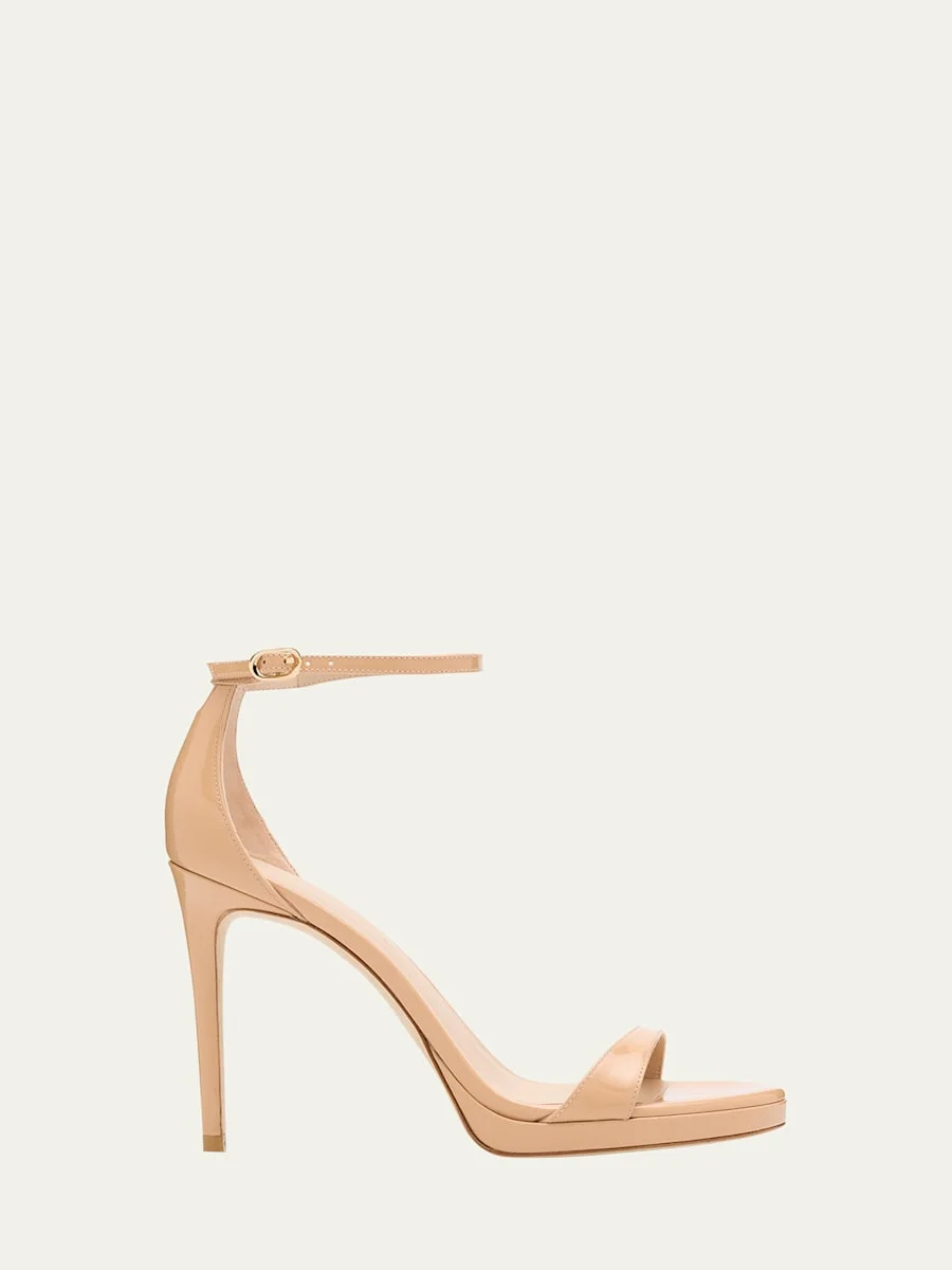 Stuart Weitzman "Nudist" glossy patent leather platform sandals 4.00 in / 100 mm stiletto heel Open toe Adjustable ankle strap Leather outsole Lining: Leather Professional cleaning recommended Made in Spain