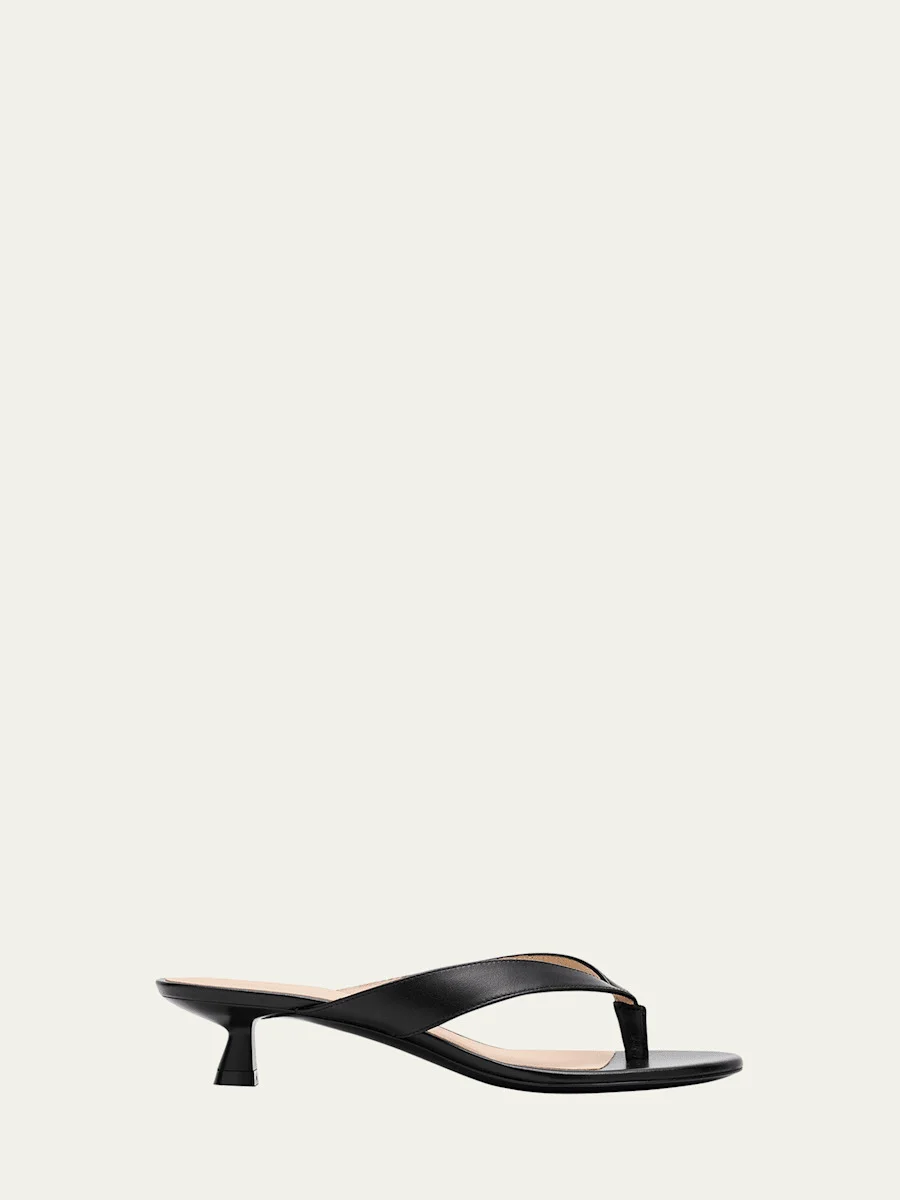 Stuart Weitzman "Rio" sandals in smooth calf leather 1.38 in / 35 mm kitten heel Open toe Thong strap Leather lining and outsole Slipon style Professional cleaning recommended Made in Spain