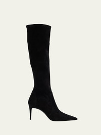 Stuart Weitzman "Stuart Power" stretch suede knee boots 3.00 in / 75 mm stiletto heel Pointed toe Pull-on style Leather lining Leather outsole Professional cleaning recommended, spot clean Made in Spain Shipping Direct from Vendor, usually ships within 15 business days. Online Inquiries: BGS21_X6T2H| Store Inquiries: #4951543