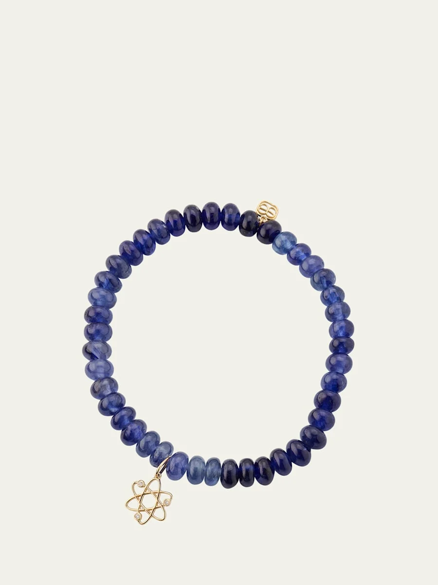 Finished with a diamonddotted orbiting charm, Sydney Evan strings blue sapphire rondelles along this signature stretch bracelet. Approx. 6.25" circumference Polished 14karat yellow gold 3 diamonds; 0.02 total carat weight Cabochoncut sapphire beads Stretchy; slipon style Imported