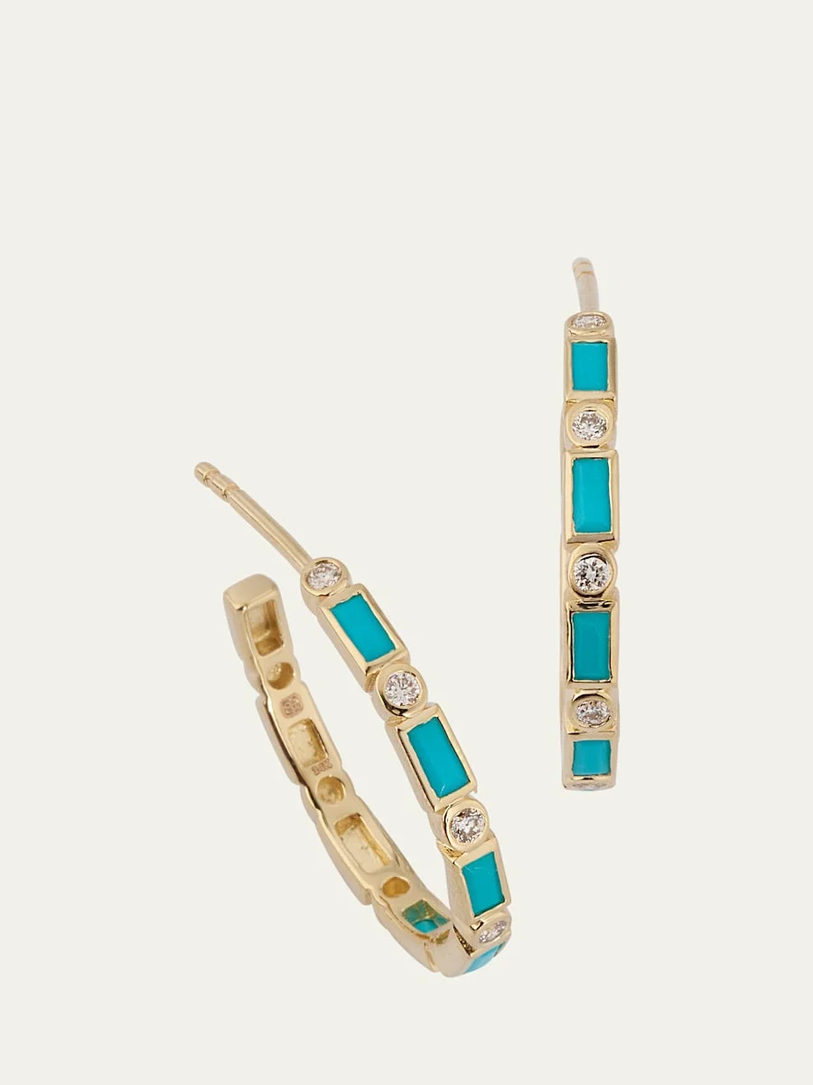 14K Gold Baguette Turquoise and Round Diamond Hoop Earrings