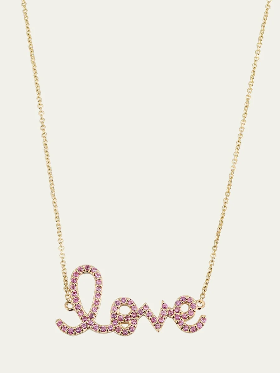 14K Gold Medium Love Script Pink Sapphire Necklace