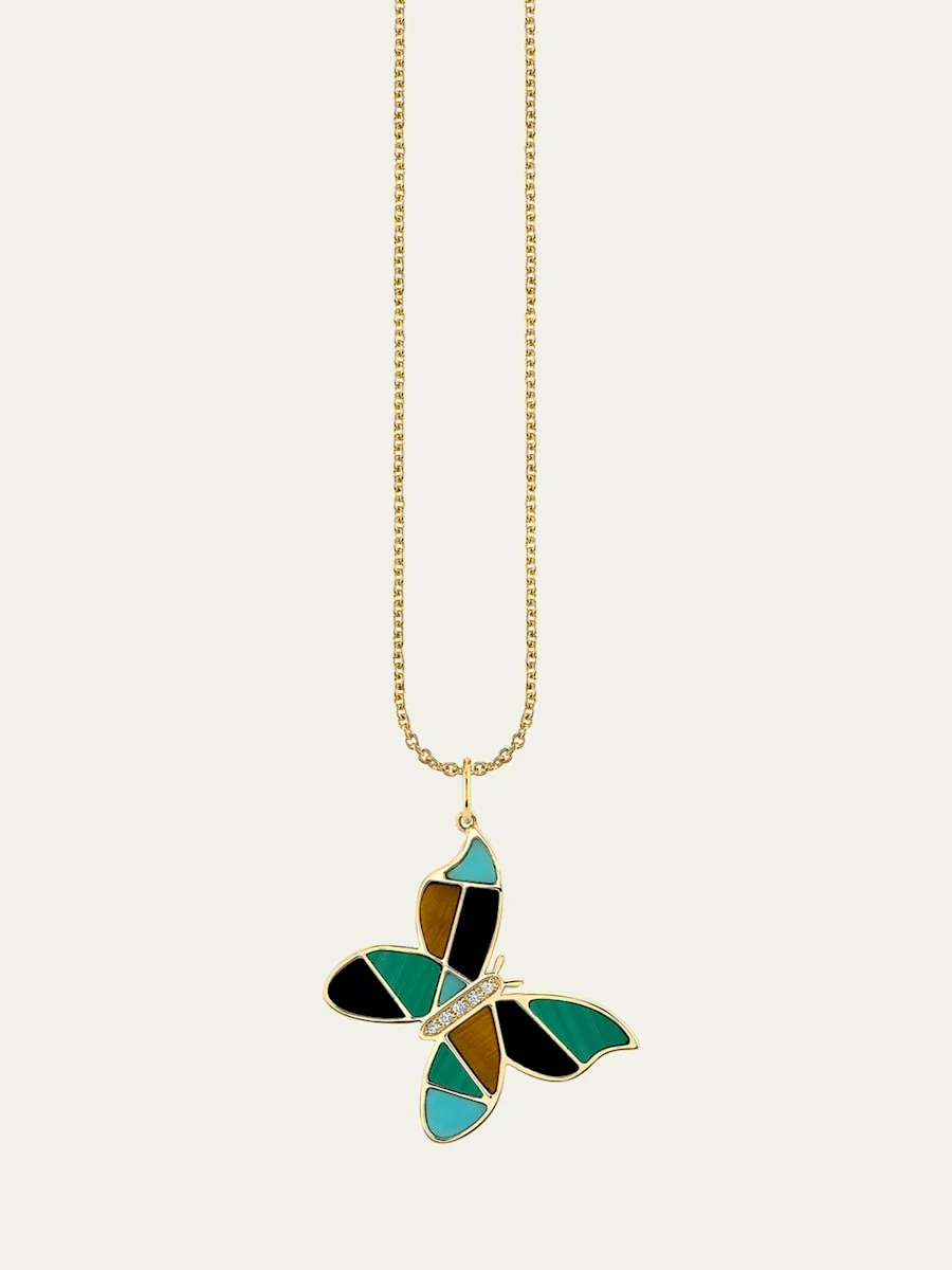 Mosaic Gemstone Butterfly Pendant with Diamonds on Tiffany Chain Necklace
