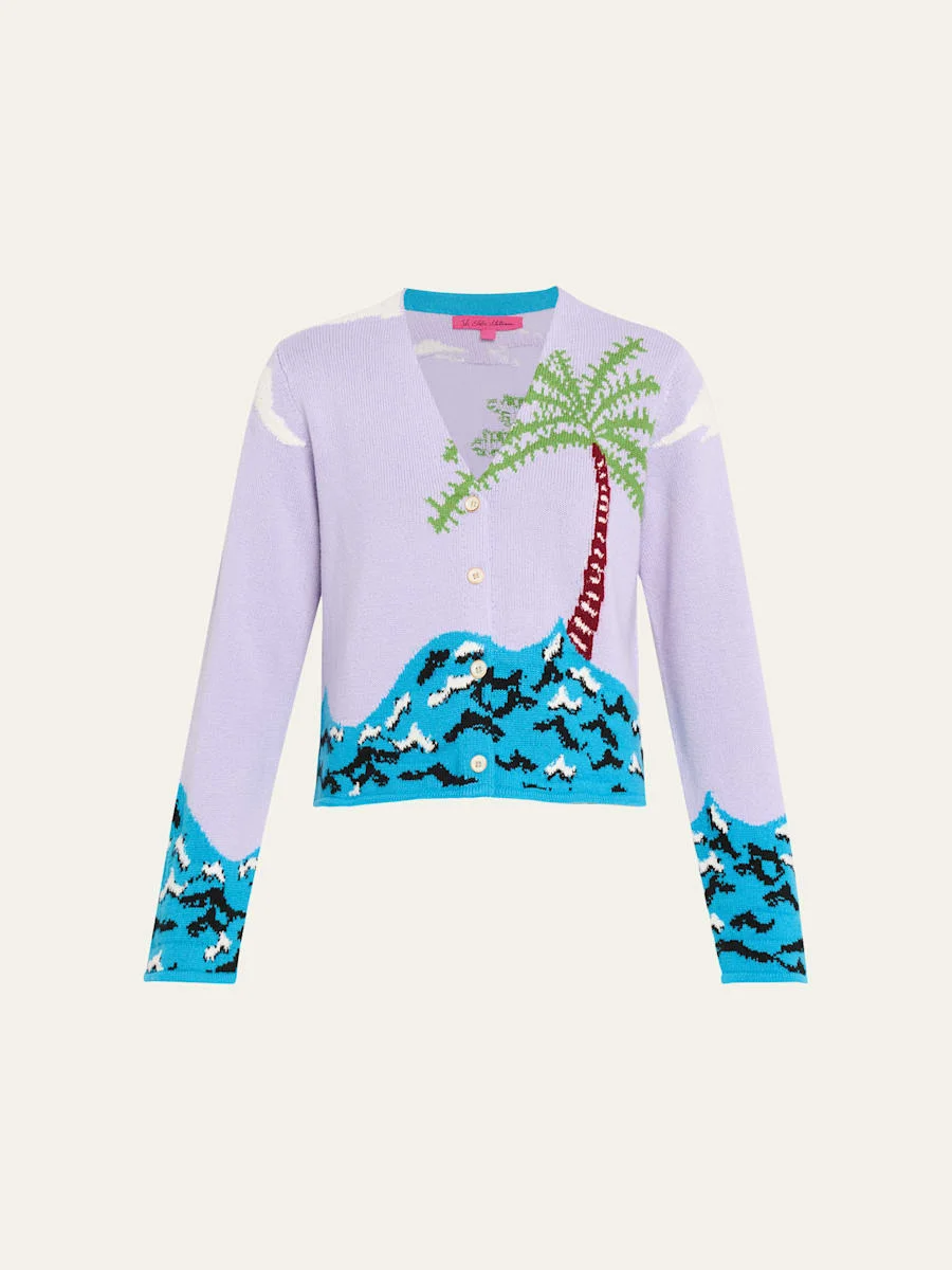 The Elder Statesman "Palm Beach" cardigan featuring original artwork intarsia exclusive to the elder statesman V neckline; button front Long sleeves Relaxed fit Cashmere/merino wool/nylon/polyamide Lining: Silk Dry clean Made in USA from imported materials Online Inquiries: BGS21_BA4SK| Store Inquiries: #5036201