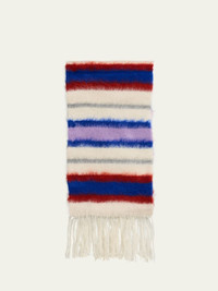 The Elder Statesman "Thistle" vineyard striped scarf in dyed Alpaca fur (Peru) Approx. 80"L x 20.0"W Fringe trim Can be styled multiple ways Animal hair/merino wool/nylon/polyamide Dry clean Made in Peru Online Inquiries: BGS21_D53XJ| Store Inquiries: #4948695