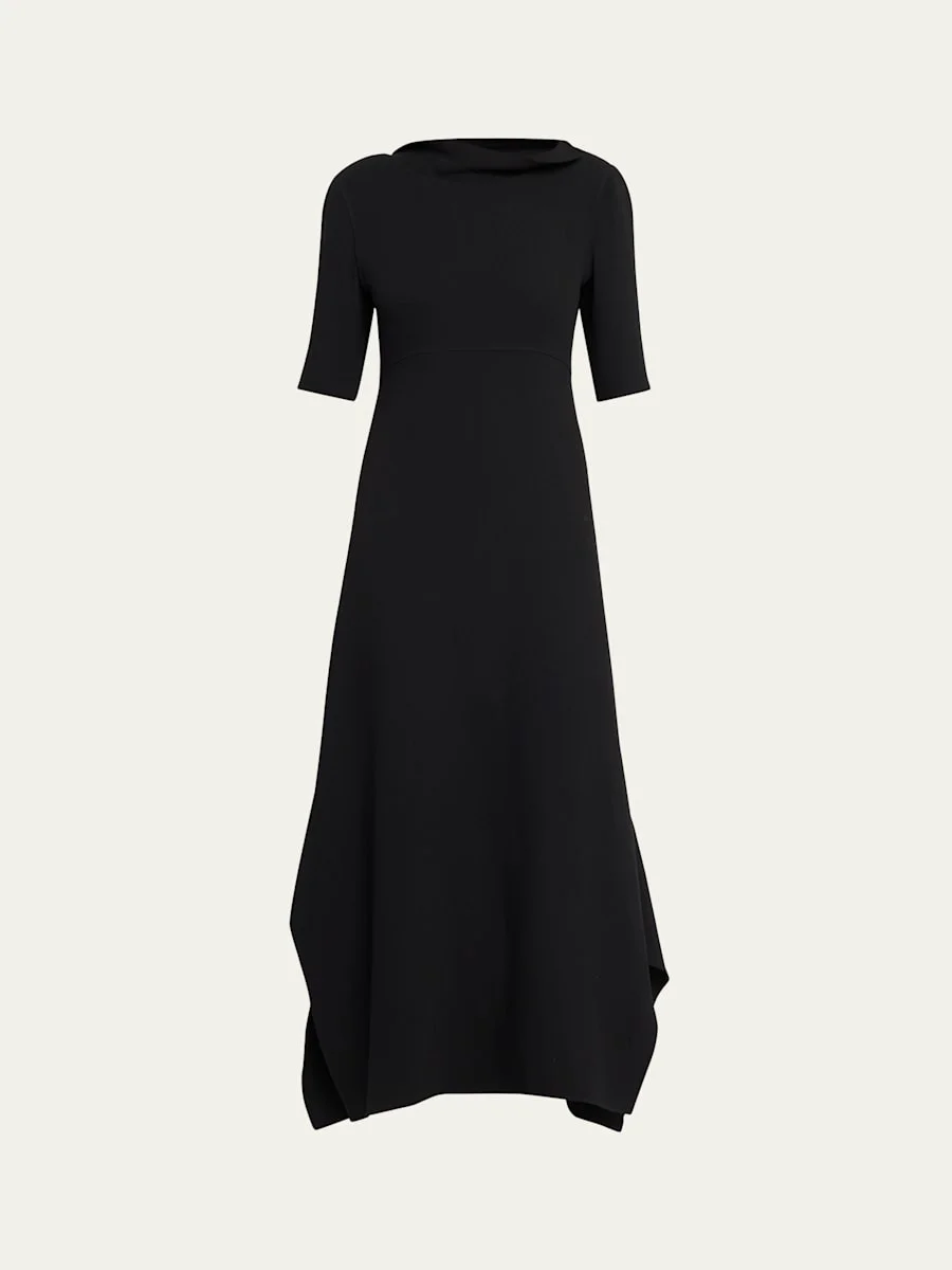 THE ROW "Faede" crisp silk georgette dress with a folded drape detail at back Asymmetric neckline; low-cut back Elbow-length sleeve Calf length A-line silhouette Asymmetric draped side slits Back zip Silk Made in Italy Online Inquiries: BGS21_B9R3W| Store Inquiries: #4948640