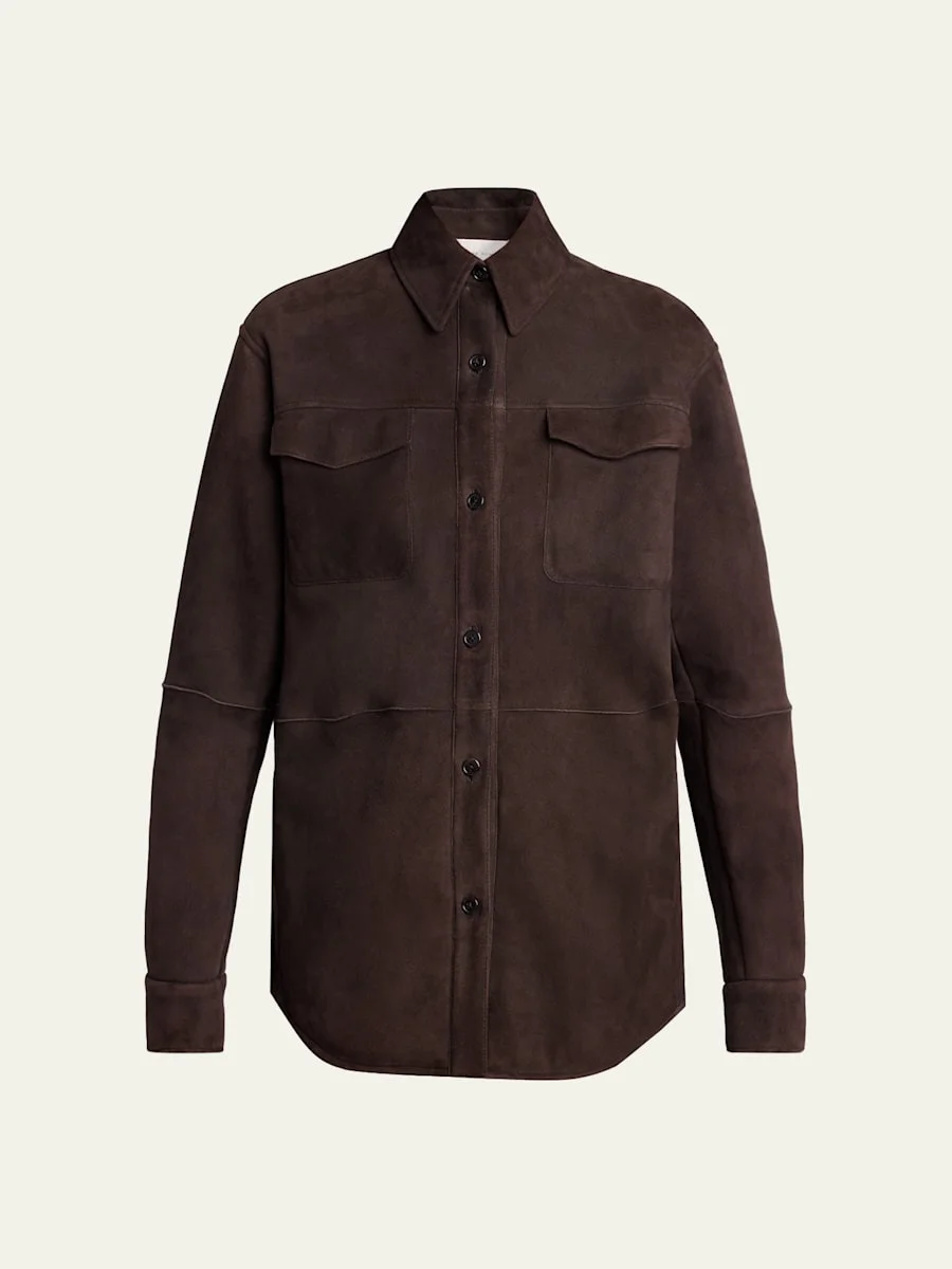 THE ROW "Gwena" shirt jacket in dyed sheep shearling (Italy) Point collar; button front Long sleeves; button cuffs Chets flap patch pockets Side seam pockets Straight fit Shirttail hem Shearling Made in Italy Online Inquiries: BGS21_BAAQC| Store Inquiries: #5068735