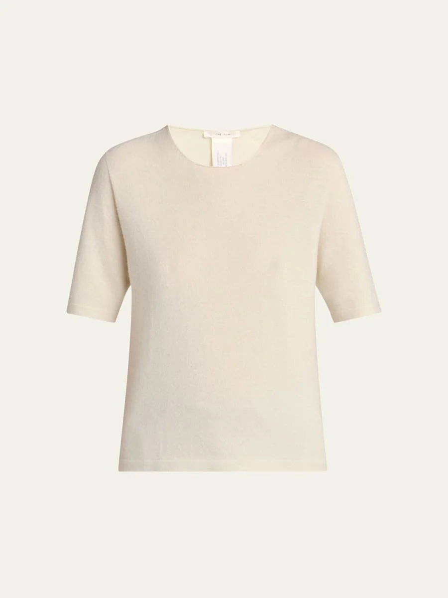 THE ROW "Ipar" knit top Crew neckline Short sleeves Relaxed fit Pullover style Cashmere Made in Italy Model is 5'10"/177cm. Online Inquiries: BGS21_B9MAC| Store Inquiries: #4912147