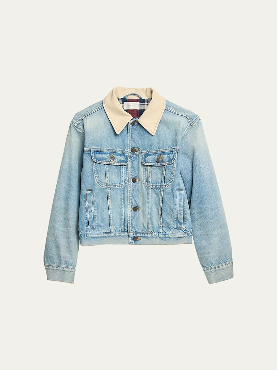 THE ROW Joras" denim jacket enhanced with a contrasting corduroy collar Long sleeves with button cuffs Dual chest pockets Side slip pockets Classic fit Cropped length Button-front Cotton Made in Italy Online Inquiries: BGS21_BA39W| Store Inquiries: #5024341