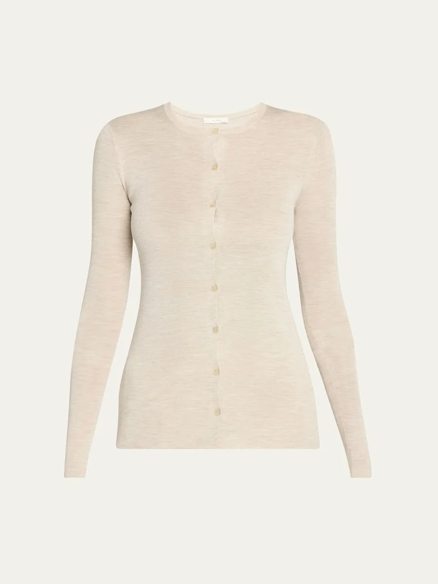 THE ROW "Josette" knit cardigan Crew neckline; button front Long sleeves Slim fit Silk Made in Italy Online Inquiries: BGS21_B9V16| Store Inquiries: #4977665
