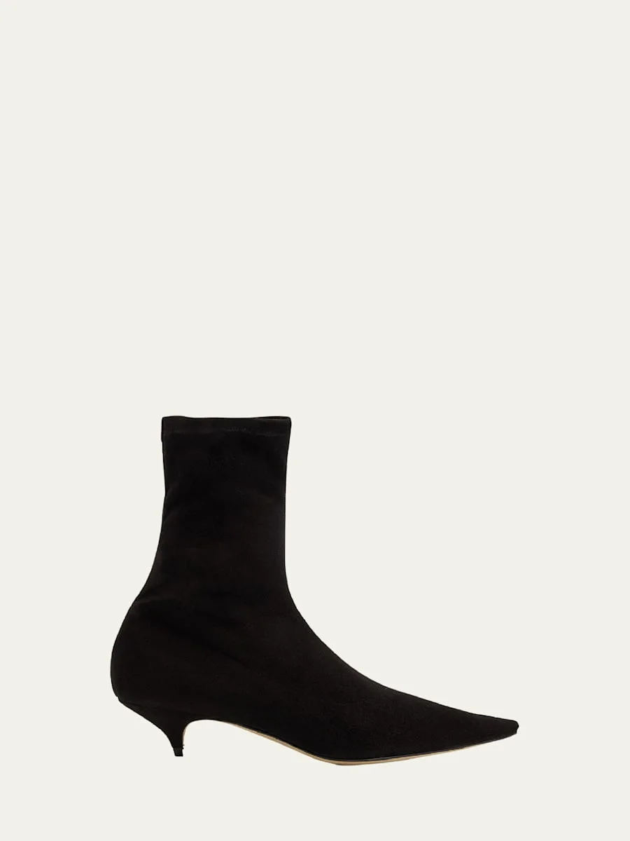 THE ROW "Liisa" suede booties 1.38 in / 35 mm kitten heel Pointed toe Side zip eases dress Leather outsole Lining: Cotton Made in Italy