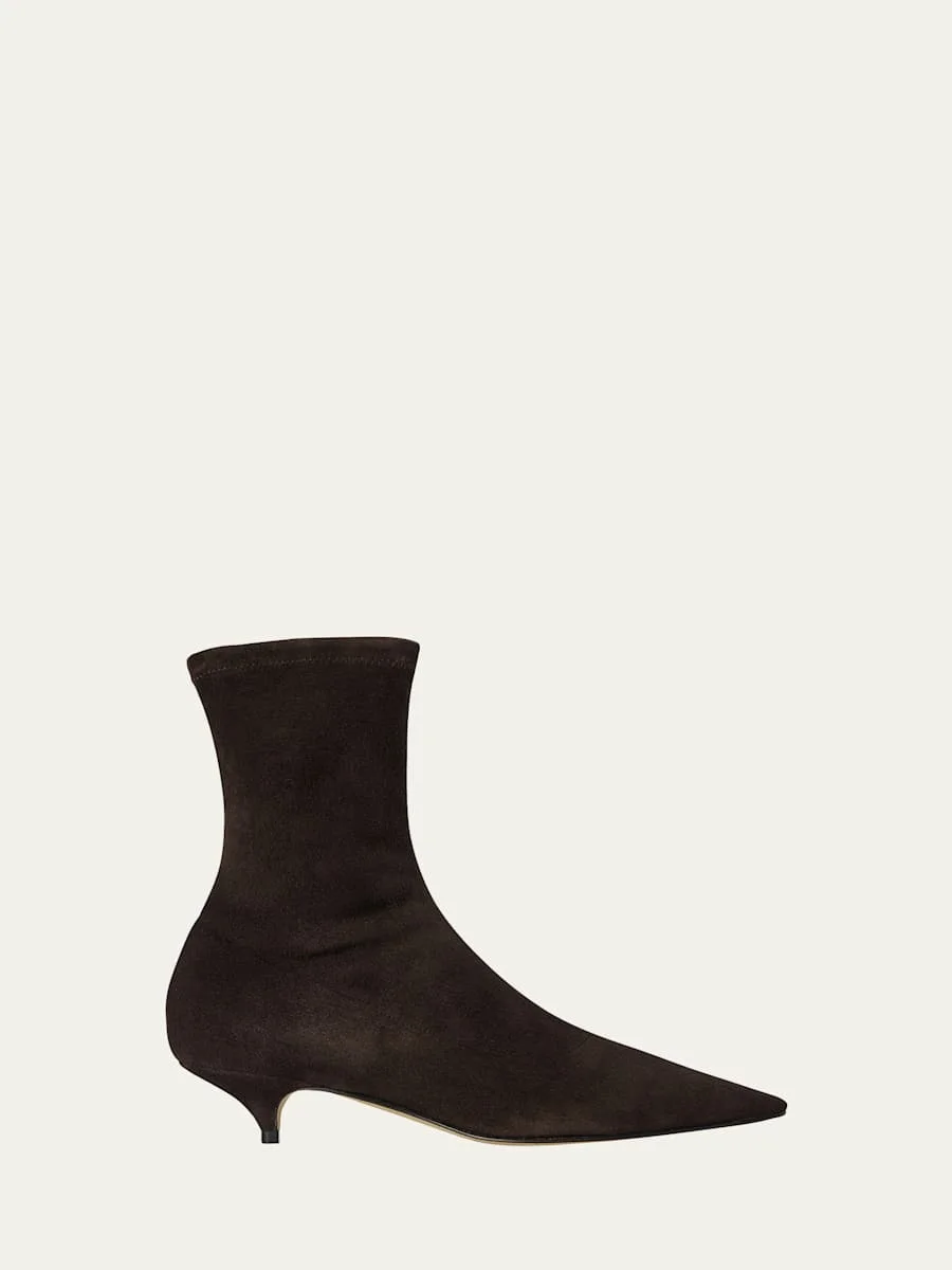 THE ROW "Liisa" suede booties 1.38 in / 35 mm kitten heel Pointed toe Side zip eases dress Leather outsole Lining: Cotton Made in Italy