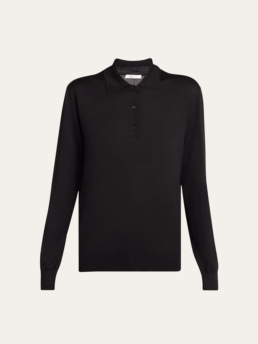 THE ROW "Lilienne" polo top in a fine silk knit Point collar; three-button front Long sleeves Relaxed fit Ribbed cuffs and hem Pullover style Silk Made in Italy Online Inquiries: BGS21_BAAQB| Store Inquiries: #5068721