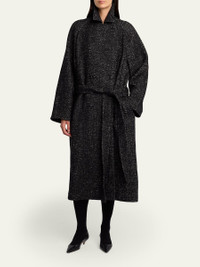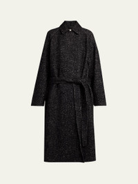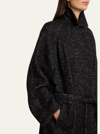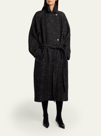 THE ROW "Macaria" coat is crafted of a marble woolblend and is cinched at the waist with a self belt Point collar; doublebreasted front Long raglan sleeves Selftie belted waist Hip welt pockets Oversized fit Hem falls below the knee Walking vent back Wool/silk Made in Italy