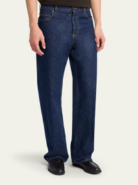 The "Rossen" jeans from THE ROW are crafted in rinsed indigo cotton denim with contrast topstitching to highlight the expert construction. Regular rise Fivepocket style Classic fit through straight legs Buttonzip front; belt loops Cotton Made in Italy