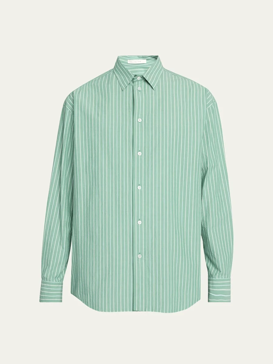 THE ROW poplin dress shirt in double-stripe pattern Point collar Button-down front Long sleeves Rounded barrel cuffs Shirttail hem Cotton Made in Italy Online Inquiries: BGS21_NDFE5| Store Inquiries: #5034254