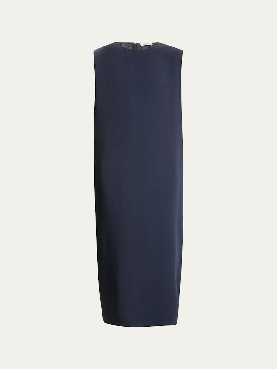 "Mirna" dress by THE ROW. Approx. 43.5"L from shoulder to hem (size S). High, round neckline. Sleeveless. Side slip pockets. Straight-cut silhouette. Back zip and vent. Hem falls below the knee. Triacetate/polyester. Dry clean. Made in Italy. Online Inquiries: BGS21_B63VY| Store Inquiries: #4018286