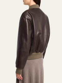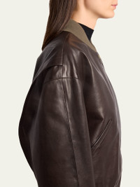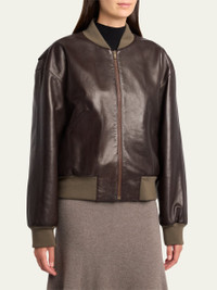 THE ROW "Morisel" bomber jacket is crafted of pebbled calfskin leather with wool ribbed knit trim Baseball collar; zip front Long sleeves Front welt pockets Loose fit Hip length Ribbed cuffs and hem Leather/virgin wool Made in Italy Online Inquiries: BGS21_BB2X3| Store Inquiries: #5470192