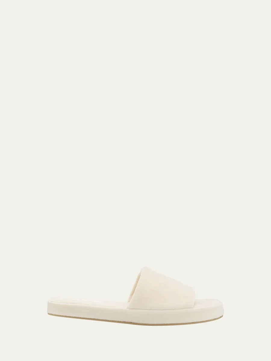 THE ROW "Pillow" cozy soft cotton slippers 0.25 in / 10 mm flat heel Open toe Wide band upper Slide style Rubber outsole Lining: Cotton Made in Italy