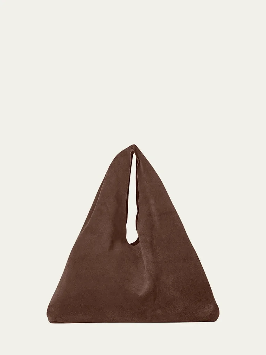 Soft and unstructured, the small "Bindle" top-handle bag from THE ROW is crafted in plush calfskin suede with a single seam Top handle, 6.3" drop Open top Unlined Approx. 9.8"H x 12.9"W x 0.7"D Made in Italy Online Inquiries: BGS21_V6KUV| Store Inquiries: #5031889