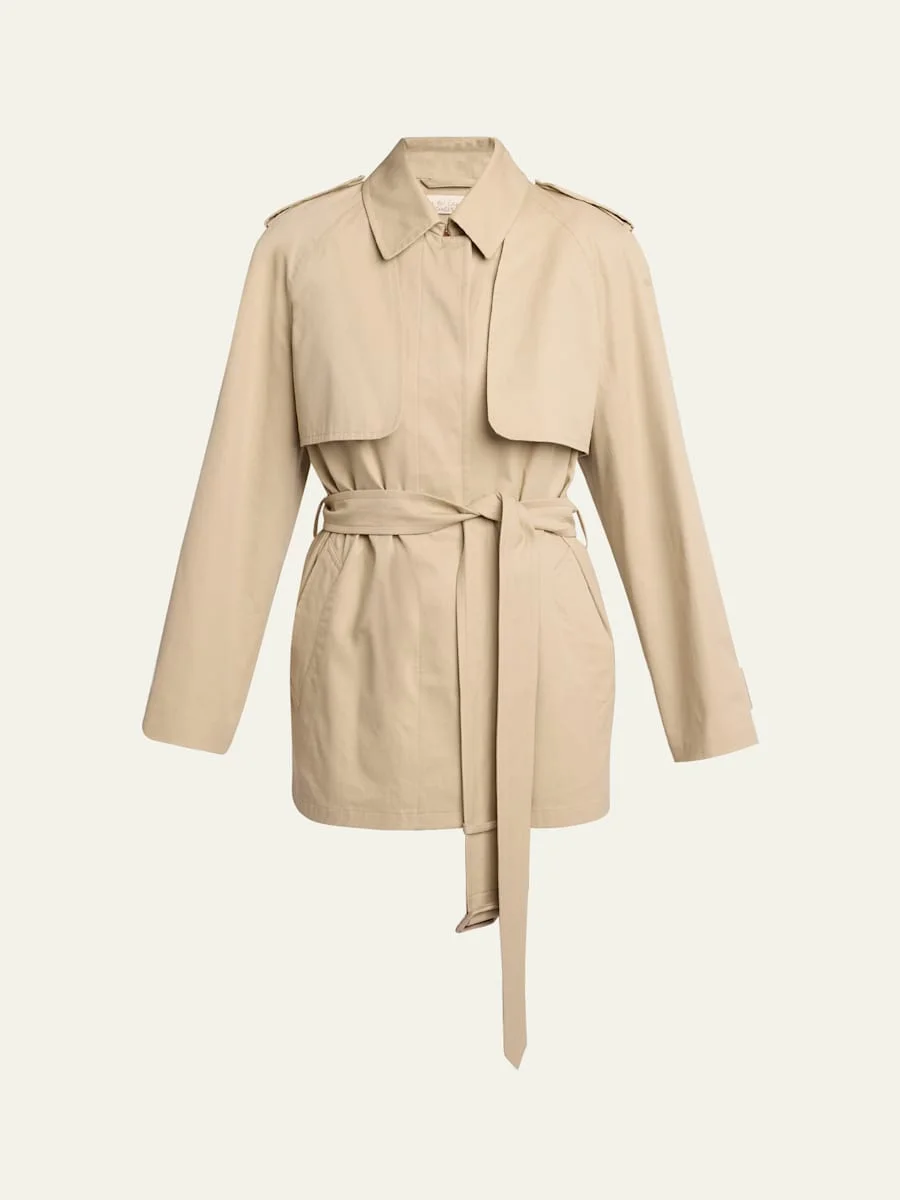 THE ROW "Tavoris" hybrid trench jacket is crafted of a cotton twill and consists of a belted vest and a removable bolero jacket atop Point collar with throat latch; concealed button front Long sleeves; button cuffs Shoulder epaulets Selftie belted waist Hip welt pockets Straight fit Hem falls below the hip Cotton Made in Italy