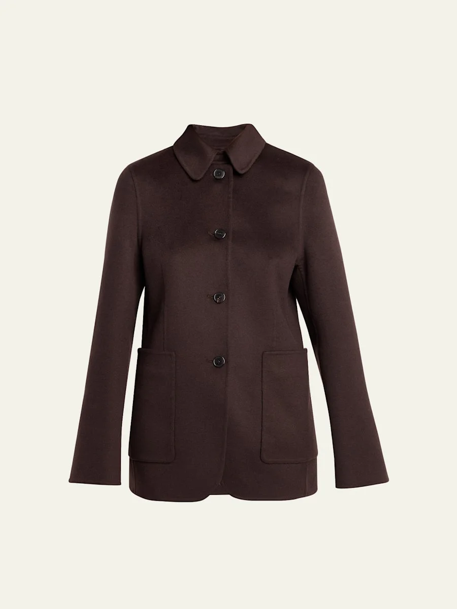 THE ROW "Tiras" jacket is crafted of a brushed cashmere Curved collar; single-breasted front Long sleeves; unfinished cuffs Hip patch pockets Straight fit Hem falls below the hip Button closure Cashmere Made in Italy Online Inquiries: BGS21_BB1YM| Store Inquiries: #5444445