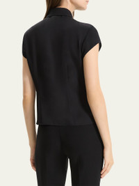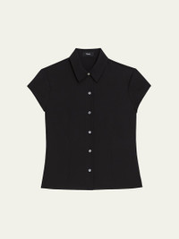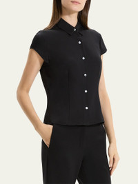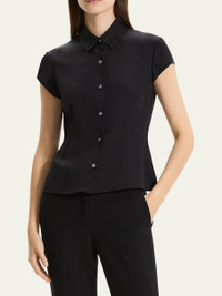 Theory shirt blouse tailored with front and back darts Approx. 20.5"L from shoulder to hem Spread collar Short cap sleeves Buttonfront placket Fitted Silk Dry clean Imported Size Note: Item runs small, consider ordering a size up. Model height: 5'10"/177cm.
