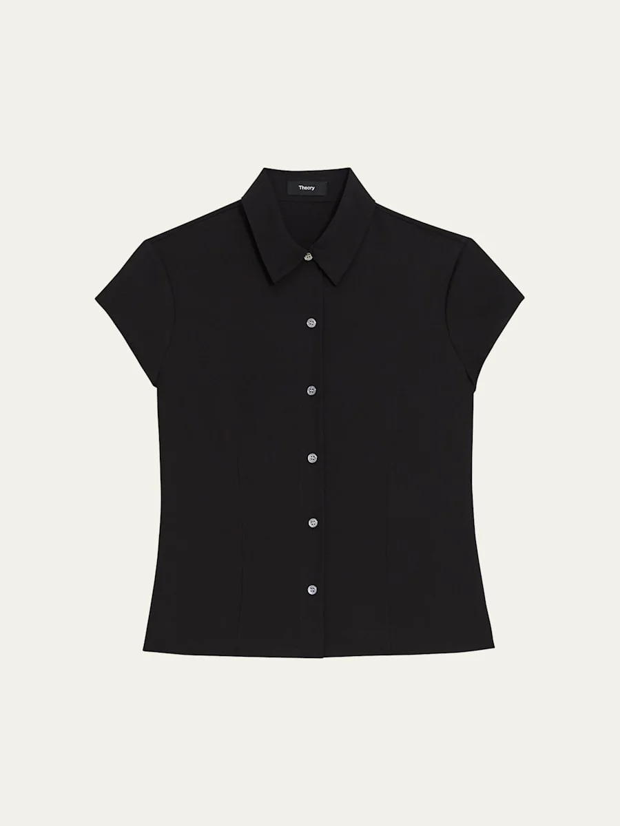 Theory shirt blouse tailored with front and back darts Approx. 20.5"L from shoulder to hem Spread collar Short cap sleeves Button-front placket Fitted Silk Dry clean Imported Size Note: Item runs small, consider ordering a size up. Model height: 5'10"/177cm. Online Inquiries: BGS21_T5K9Q| Store Inquiries: #4738514