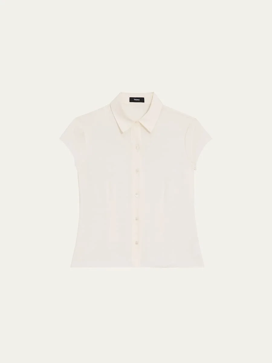 Theory shirt blouse tailored with front and back darts Approx. 20.5"L from shoulder to hem Spread collar Short cap sleeves Button-front placket Fitted Silk Dry clean Imported Model is 5'10"/177cm. Online Inquiries: BGS21_T5K9Q| Store Inquiries: #4738514