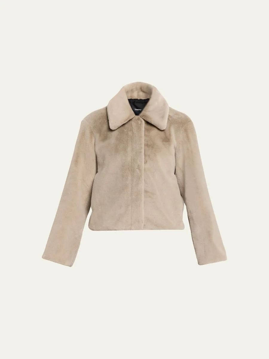 Crafted of soft faux fur (polyester), this cropped coat from Theory features a spread collar and slip pockets. Long sleeves Classic fit Gathered hem Zip-front with snap-over placket Polyester Dry clean Imported Online Inquiries: BGS21_T83Q9| Store Inquiries: #5235421