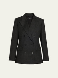 Tuxedo jacket tailored in solid wool by Theory. Peak lapels Double-breasted front Long sleeves with button cuffs Hip flap pockets Tailored fit Double-vented back Button-front Virgin wool Dry clean Made in Australia Online Inquiries: BGS21_T8QZW| Store Inquiries: #5363226