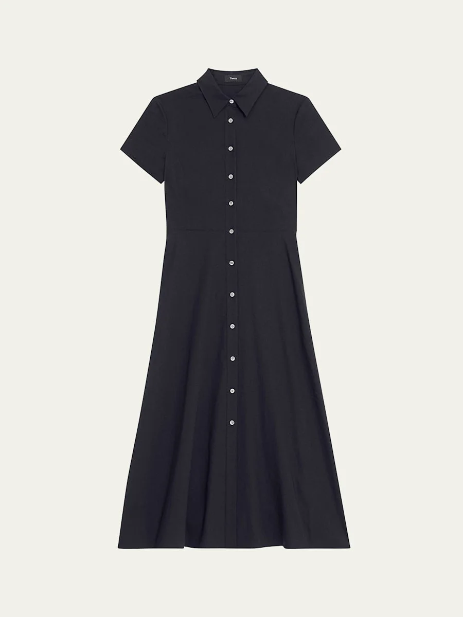 Theory shirt dress with a fitted upper and full button placket Approx. 46.3”L from shoulder to hem Spread collar Short sleeves; approx. 14.3"L On-seam pockets Hem falls below the knee A-line silhouette Linen/viscose/elastane Dry clean Imported Size Note: Height: 5'11"/ waist 24”/ hips 35"/ bust 30" Model is wearing size 2 Online Inquiries: BGS21_T6K95| Store Inquiries: #4779594