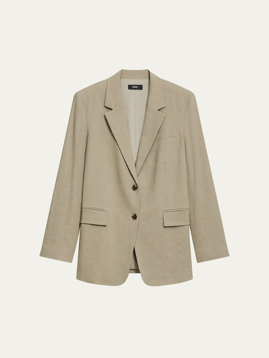 An oversized, straight-fit, single-breasted blazer with lower flap pockets, welt chest pocket, and vented button closure at sleeves. Theory oversized blazer featuring a single-breasted front in Crunch Linen Notch lapels Long sleeves with button cuffs Chest welt pocket Hip flap pockets Straight fit Double-vented back Button-front Linen/viscose/elastane Dry clean Imported Online Inquiries: BGS21_T6H7G| Store Inquiries: #4986424
