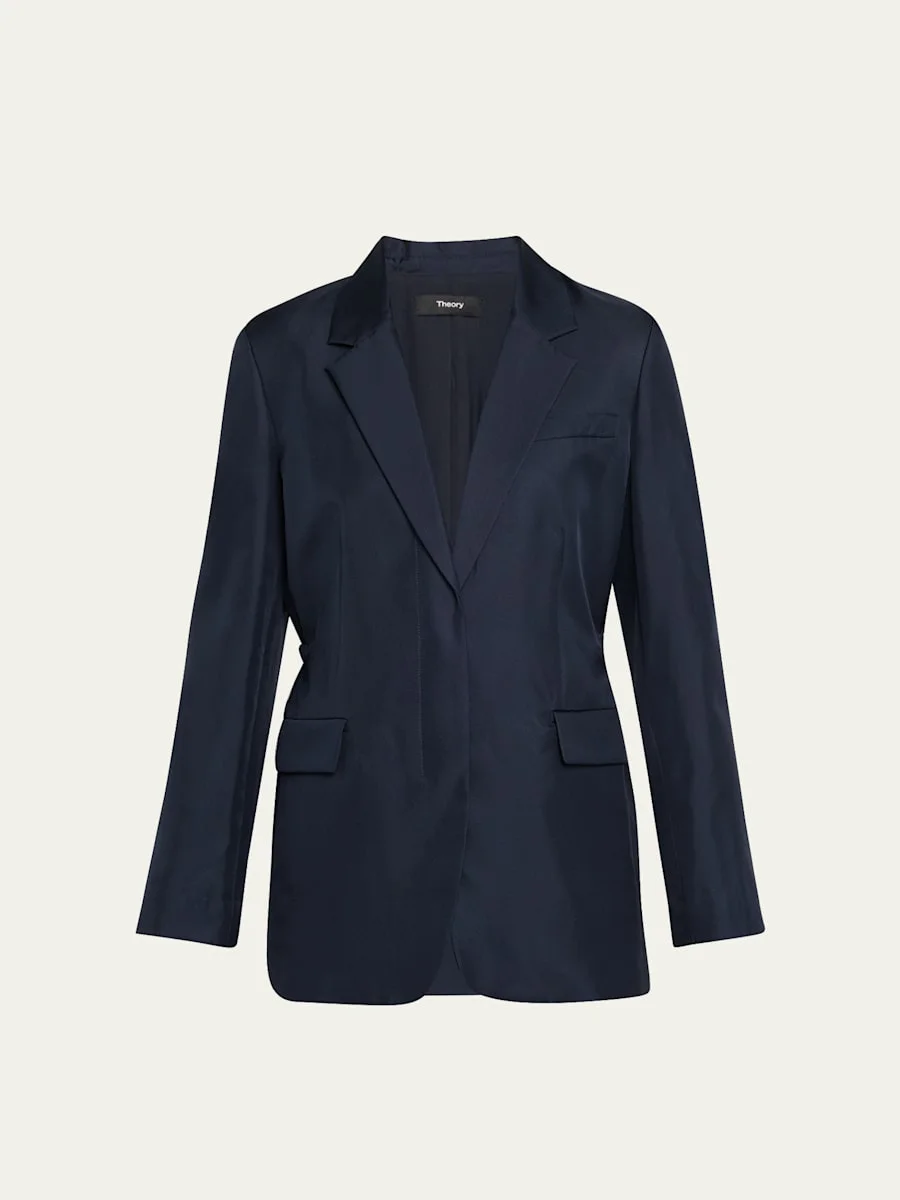 Theory luxurious silk blazer enhanced with a cinched back for added shape Notch lapels Single-breasted front Long sleeves with vented cuffs; approx. 32"L Chest welt pocket Hip flap pockets Oversized fit Concealed button-front Silk Dry clean Imported Online Inquiries: BGS21_T6Z4N| Store Inquiries: #5073469
