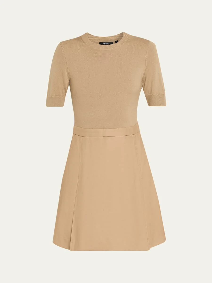 A combination dress by Theory that features a soft knit bodice finished with a tailored skirt with deep pleats. Crew neckline Short sleeves; approx. 16"L A-line silhouette Hem falls above the knee Slipover style Cotton Dry clean Imported Online Inquiries: BGS21_T85Z0| Store Inquiries: #5242610