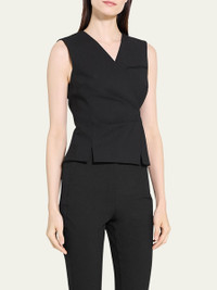 Theory shrunken vest elevated with a draped wrap front V neckline Double-breasted front Sleeveless Chest welt pocket Tailored fit Hem sits at the hip Front hook closure Wool/elastane Dry clean Imported Online Inquiries: BGS21_T6Z4G| Store Inquiries: #5073463