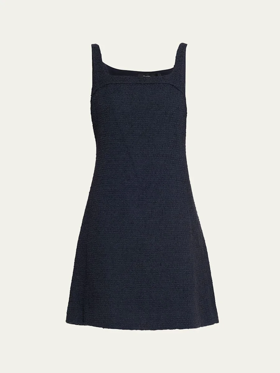Sleek tweed mini dress by Theory. Square neckline Sleeveless Aline silhouette Hem falls above the knee Invisible side zip Cotton/virgin wool Dry clean Made in New Zealand