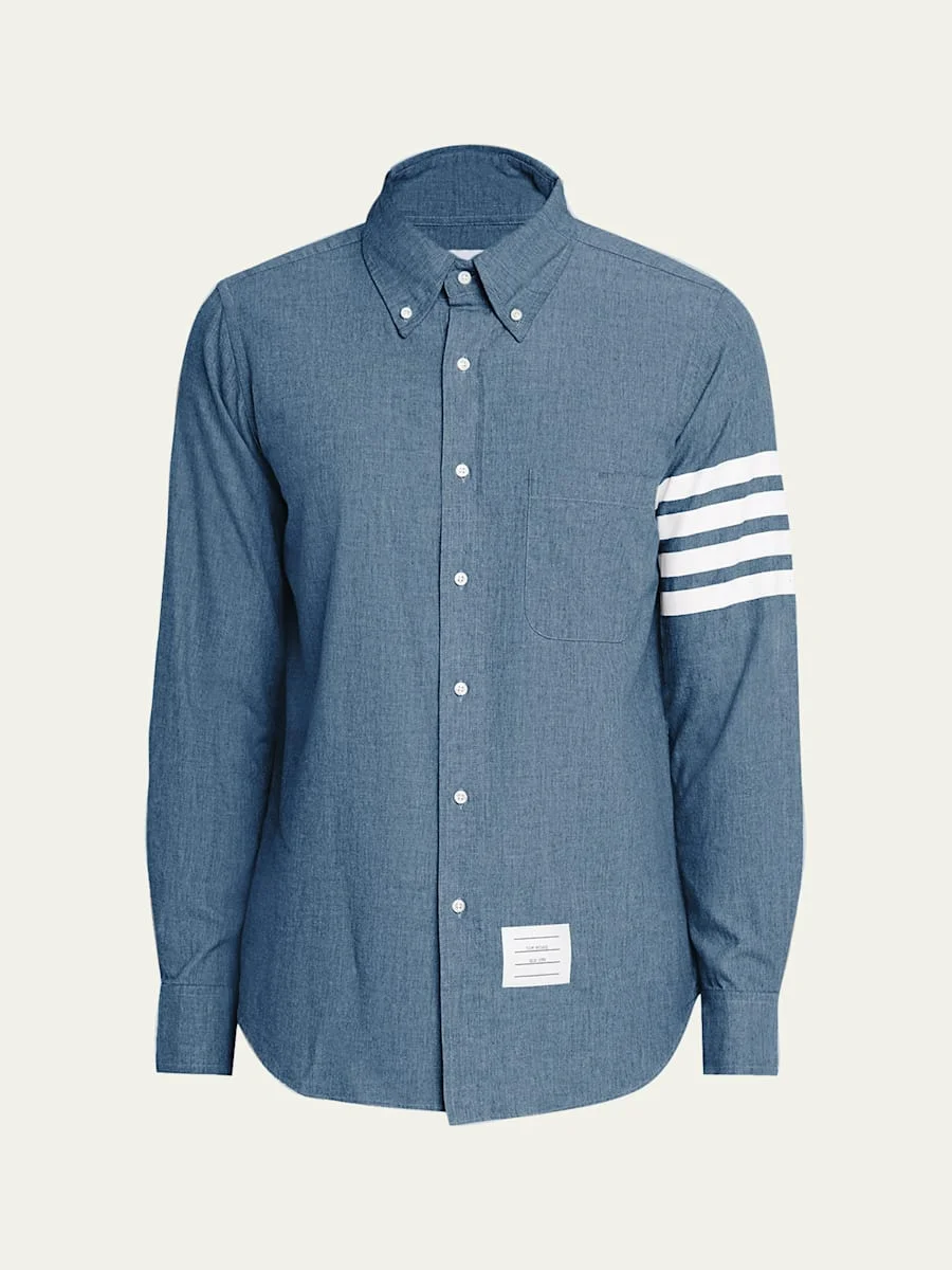 Thom Browne straight fit button down sport shirt. Spread collar; button front. Long sleeves with printed chambray 4bar stripes. Barrel sleeves. Shirttail hem. Cotton. Made in Italy.