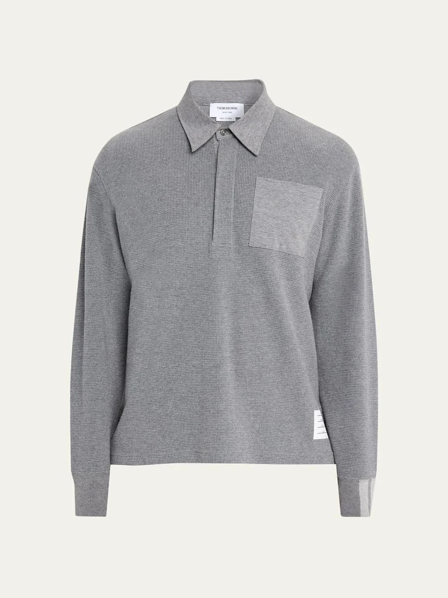 This Thom Browne rugby shirt is crafted from breathable waffle knit cotton, finished with the signature name tag applique. Point collar Concealed half placket Contrast chest pocket Ribbed cuffs Vented sides with striped grosgrain trim Pullover style Cotton Dry clean Made in Japan
