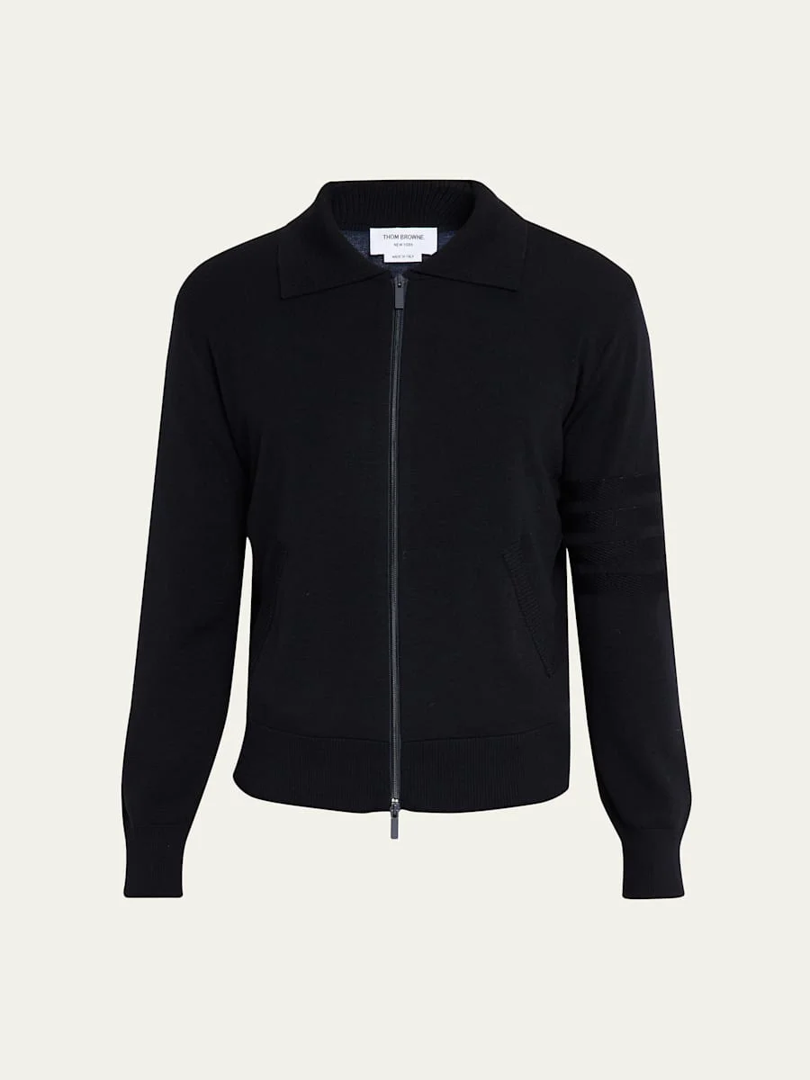 Thom Browne solid knit sweater in a premium double-face wool blend Tonal 4-bar stripe on the left sleeve Spread collar Two-way zip front Side slip pockets Long sleeves Ribbed cuffs and hem Signature striped grosgrain loop tab Wool/linen/cotton Dry clean Made in Italy Online Inquiries: BGS21_NDGCK| Store Inquiries: #5038873