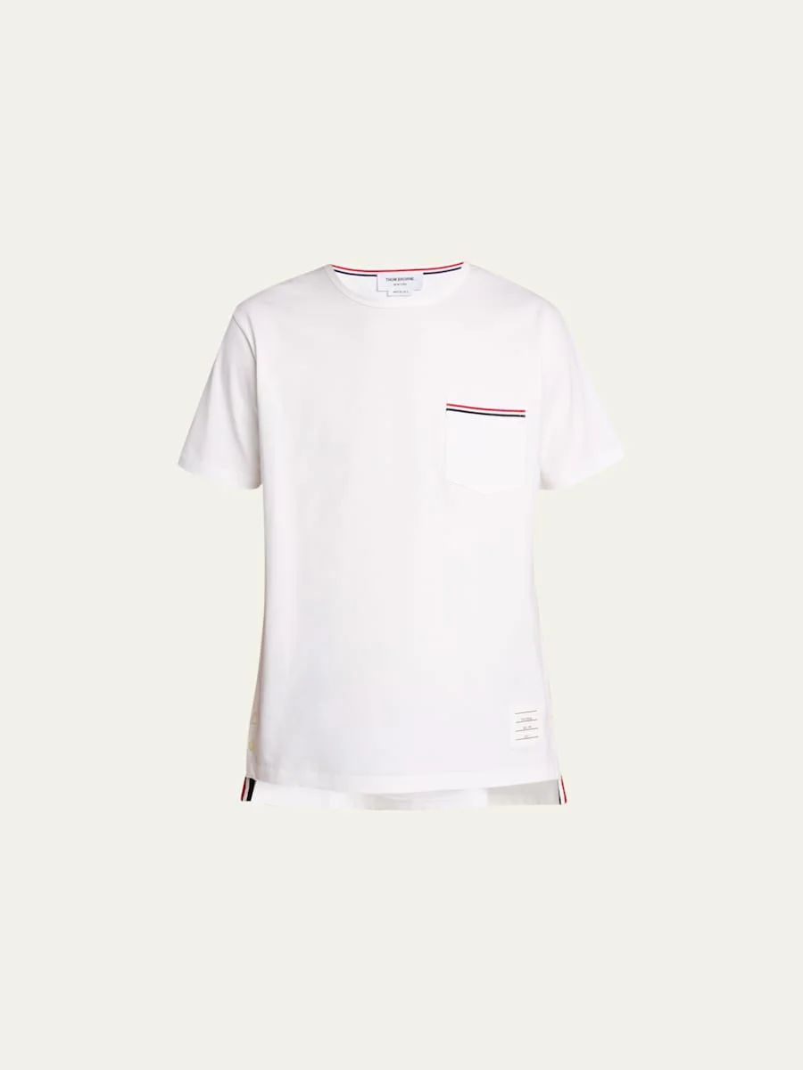 Thom Browne knit T-Shirt with logo stripe details. Crew neckline. Short sleeves. Front patch pockets. Pullover style. Cotton. Made in Italy. Model is 6'1"/185cm. Online Inquiries: BGS21_N4H5T| Store Inquiries: #2065906