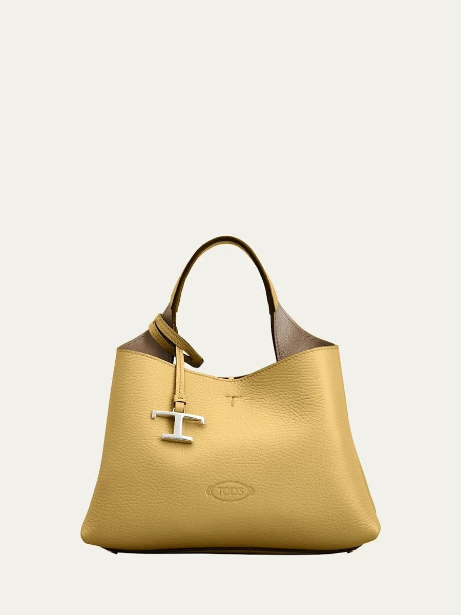 Tod's "Apa" grainy leather top handle bag with t-stitching accent Top handle with removable T logo pendant charm Detachable shoulder strap Can be worn as a top handle or shoulder bag Open top with lobster clasp closure Center zip compartment divides interior Feet protect bottom of bag Approx. 6.7"H x 9.8"W x 5.7"D Made in Italy Online Inquiries: BGS21_V6H94| Store Inquiries: #4994279