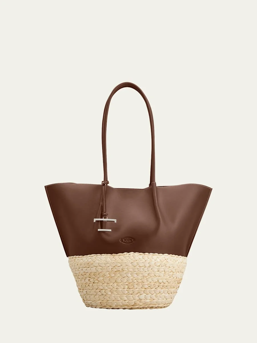 Tod's "Bux" napa calfskin leather and handwoven corn leaf shopping tote bag Features tod's logo stamped on the front Shoulder straps with removable T logo pendant charm, 10.6" drop Open top with magnetic closure Approx. 12.2"H x 16.9"W x 6.1"D Nylon/polyurethane Made in Italy Online Inquiries: BGS21_V6H97| Store Inquiries: #4994282