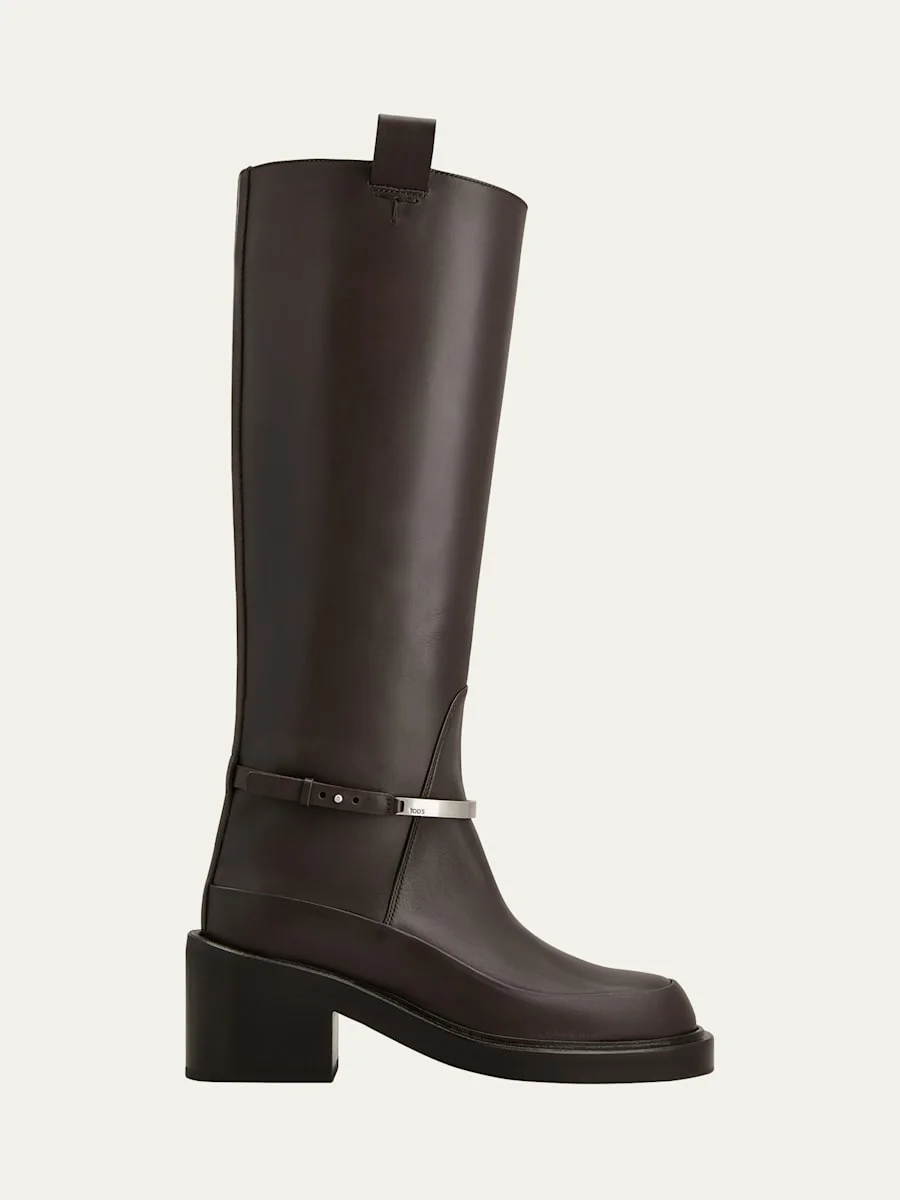 Adorned with a branded metal bar accessory at the ankle, these kneehigh boots by Tod's are crafted from calf leather 2.36 in / 60 mm block heel Round toe Pull tabs at collar Pullon style Leather lining Rubber outsole Spot clean Made in Italy